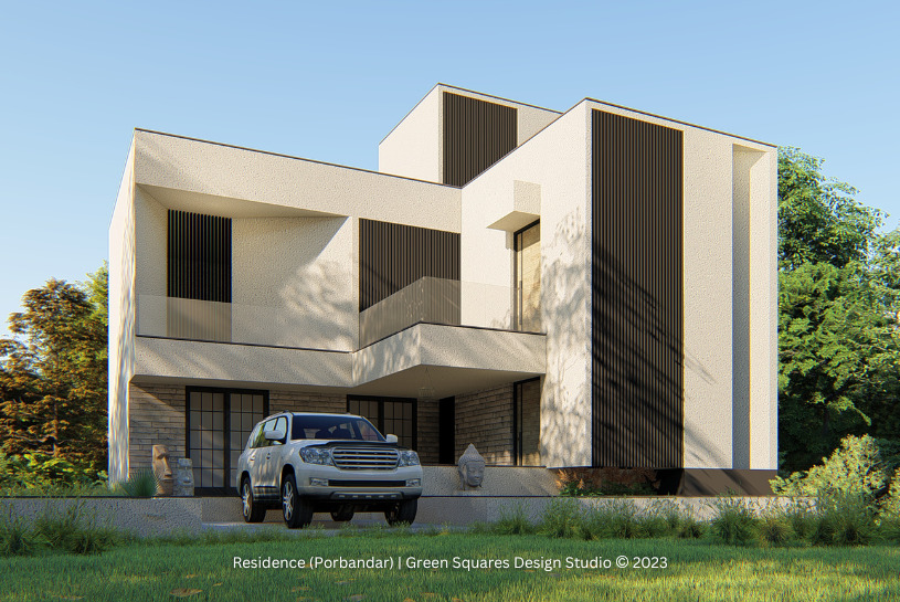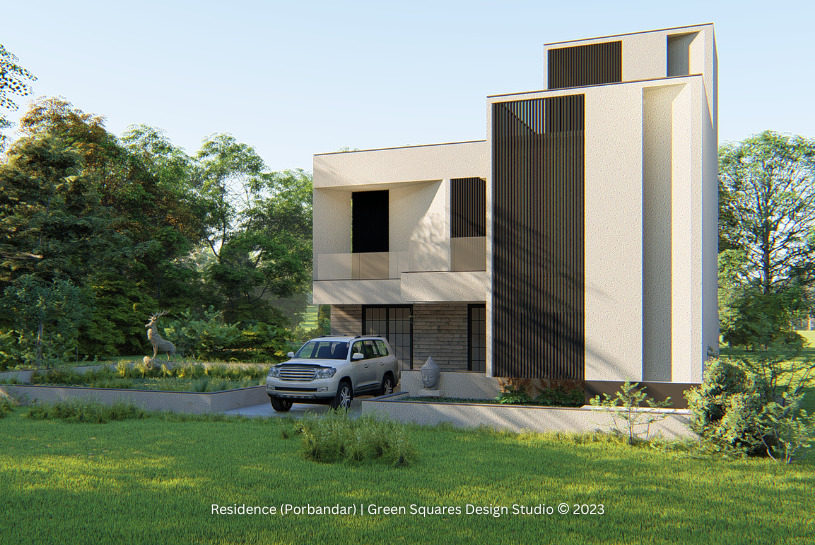 It is a residential bungalow situated in Porbandar with minimal, clean lines and a modern minimalistic theme which is characterized by it's simplicity, clarity, and functionality. The focus was on clean lines and uncluttered spaces with a minimal use of other elements. The exterior of the bungalow is typically characterized by a simple and elegant design with a sleek and minimalist façade. The use of materials such as glass and steel can create a sense of openness and lightness. The bungalow is designed to be functional and efficient, with an emphasis on natural light and open spaces. The use of neutral colors such as white and beige creates a calming and relaxing atmosphere. The elements are typically simple and functional, with clean lines and minimal ornamentation. The use of space was also carefully considered, with an emphasis on creating an uncluttered and streamlined environment. The minimalist design creates a sense of order and tranquility, allowing the occupants to focus on the essential elements of their living space. The overall result is a contemporary and sophisticated bungalow that is both beautiful and functional.